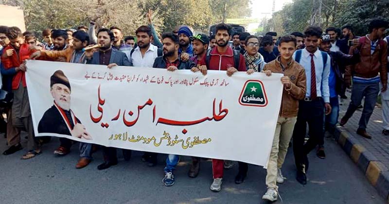 Younis Noshahi, Ahsan Ayaz, Mian Anser Mahmood, Fraz Hashmi and others were present on the occasion. The students carried placards and banners with the anti-terrorism slogans written on them.
