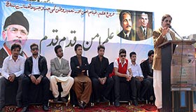 لاہور (27 فروری 2015) مصطفوی سٹوڈنٹ موومنٹ کے زیر اہتمام منعقدہ امن سمینار سے پاکستان عوامی تحریک کے مرکزی سیکرٹری جنرل خرم نواز گنڈاپور نے خطاب کرتے ہوئے کہا کہ یکساں نصاب تعلیم کو قومی ایکشن پلان کا حصہ بنایا جائے کیونکہ طبقاتی نظام تعلیم اور امتیازی نصاب بھی دہشتگردی کے فروغ کی ایک بڑی وجہ ہے، نوجوانوں کی ترقی کیلئے دعوے بہت کیے جاتے ہیں مگر عملاً سول ایڈمنسٹریشن کچھ نہیں کرتی، امن سیمینار مصطفوی سٹوڈنٹس موومنٹ ماڈل ٹاؤن کالج کی تنظیم کے اشتراک سے منعقد ہوا سیمینار سے مرکزی صدر عرفان یوسف، بیدار بخت، ڈاکٹر اویس گیلانی، عمران جٹ، حمزہ سلیم، طلحہ مقبول، سجاد علی، نادر گجر، ذیشان جٹ نے خطاب کیا۔