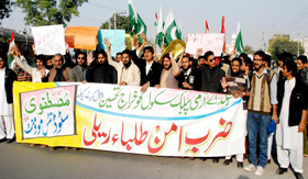 فیصل آباد ( ) مصطفوی سٹوڈنٹس موومنٹ کے زیراہتمام آرمی پبلک سکول پشاور کے شہید بچوں کی یاد اور اظہار عقیدت و محبت میں ضرب امن طلباء ریلی نکالی گئی۔ ریلی سے مصطفوی سٹوڈنٹس موومنٹ سنٹرل پنجاب کے صدرمیاں عنصرمحمود، تحریک منہاج القرآن کے ضلعی ناظم رانا رب نواز انجم، صدر شاہدسلیم، ناصروارثی، محمد عامرگجر، محمدآصف عزیز، ملک سرفراز قادری نے خطاب کرتے ہوئے کہا کہ 16 دسمبر 2014 کو انسانیت کے دشمن اور سفاک دہشتگردوں نے پشاور میں معصوم بچوں کو شہید کر کے قومی تاریخ کا المناک سانحہ برپا کیا۔ سانحہ پشاور اور سانحہ ماڈل ٹاؤن کے بے گناہوں کی یادیں قیامت تک ہر پاکستانی کے دل میں زندہ رہیں گی۔ قوم آرمی پبلک سکول کے شہید پھولوں کو بھولی نہیں اور دہشت گردی کے خلاف متحد ہے۔ پشاور کے بچوں کے ساتھ جذباتی و قلبی وابستگی ہے۔ ہم دہشت گردی کی ہر شکل کے خلاف ہے۔ سب سے پہلے ڈاکٹر طاہرالقادری نے آپریشن ضرب عضب کی حمایت کا اعلان کیا اور خود کش حملوں اور دہشت گردی کے خلاف 600 صفحات پر مشتمل فتوی دیا۔ انہوں نے کہا کہ بچوں کو شہید کرنے والوں کا ایجنڈہ کچھ بھی ہو یہ اسلام اور پاکستان کے دشمن ہیں۔ دہشت گردی پاکستان کا سب سے بڑا مسئلہ ہے پوری قوم کو یکسو اور یک جان ہو کر اس کے خلاف لڑنا ہو گا۔ انہوں نے کہا کہ آج ضرورت اس امر کی ہے کہ عوام دہشت گردوں کے ہاتھوں مرنے کی بجائے موجودہ نظام کو موت دینے کیلئے اپنے کردار کو پہچانیں۔ اجتماعی شعور سے ہی ملک میں خوشحالی اور امن کا سورج طلوع ہو سکے گا۔ شہید بچوں کی قربانیاں ہمیشہ یاد رکھیں گے۔ آخرمیں شہید ہونے واے بچوں کیلئے دعائے مغفرت کی۔