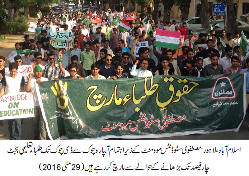 اسلام آباد/ لاہور (29 مئی 2016) مصطفوی سٹوڈنٹس موومنٹ کے زیر اہتمام آبپارہ چوک سے ڈی چوک تک حقوق طلباء مارچ کیا گیا، مارچ میں 2ہزار سے زائد طلباء نے شرکت کی۔ طلباء نے مطالبہ کیا کہ تعلیمی بجٹ کو 4فی صد تک بڑھایا جائے، طبقاتی تعلیم ختم، 10سالہ ایمرجنسی کا نفاذ، ہر قسم کے تعصب سے پاک نصاب کی ترویج، تعلیمی اداروں سے کرپشن اور انتہا پسندی کا خاتمہ کیا جائے، مارچ کی قیادت مصطفوی سٹوڈنٹس موومنٹ کے مرکزی صدر چودھری عرفان یوسف، سیکرٹری جنرل رانا تجمل حسین، ایم ایس ایم سسٹرز اسلام آباد کی صدر ڈاکٹر دیا چودھری، ڈپٹی سیکرٹری جنرل سردار محمد اویس، سنٹرل پنجاب کے صدر میاں عنصر محمود، شمالی پنجاب کے صدر ضیاء الرحمن ذلج نے کی۔ مارچ کے شرکاء نے نعرے لگائے کہ ہمیں میٹرو بسوں کے خوبصورت اسٹیشن نہیں بنیادی سہولتوں سے مزین سکول چاہئیں۔ قومی دولت فینسی منصوبوں کی بجائے تعلیم کو عام کرنے پر خرچ کی جائے طلباء نے گھوسٹ سکولوں اور گھوسٹ تعلیمی پالیسی کے خلاف نعرے لگائے۔