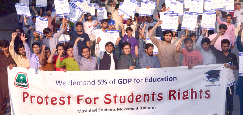 تحریک منہاج القرآن کے طلباء ونگ مصطفوی سٹوڈنٹس موومنٹ کی طرف سے لاہور پریس کلب کے باہر نکالی گئی۔ حقوق طلباء ریلی میں پانچ نکاتی چارٹر آف ڈیمانڈ پیش کرتے ہوئے کہا گیا کہ 1۔ تعلیمی بجٹ جی ڈی پی کے 5 فی صد کے برابر لایا جائے 2۔ تعلیمی اداروں کو کرپشن، انتہا پسندی اور منشیات سے پاک کیا جائے 3۔ 10 سال کیلئے تعلیمی ایمرجنسی نافذ کی جائے 4۔ فرسودہ و طبقاتی نظام تعلیم کو تبدیل کیا جائے 5۔ عوامی نمائندوں اور 18 گریڈ کے افسران کے بچوں کو سرکاری تعلیمی اداروں میں داخل کروانے کیلئے قانون سازی کی جائے۔ ریلی کی قیادت ایم ایس ایم کے مرکزی صدر عرفان یوسف نے کی۔ صدر لاہور یونس نوشاہی، رانا حسن نثار، سید فاروق شاہ، حسن چھٹہ کی قیادت میں سینکڑوں طلبہ ریلی میں شریک ہوئے۔
