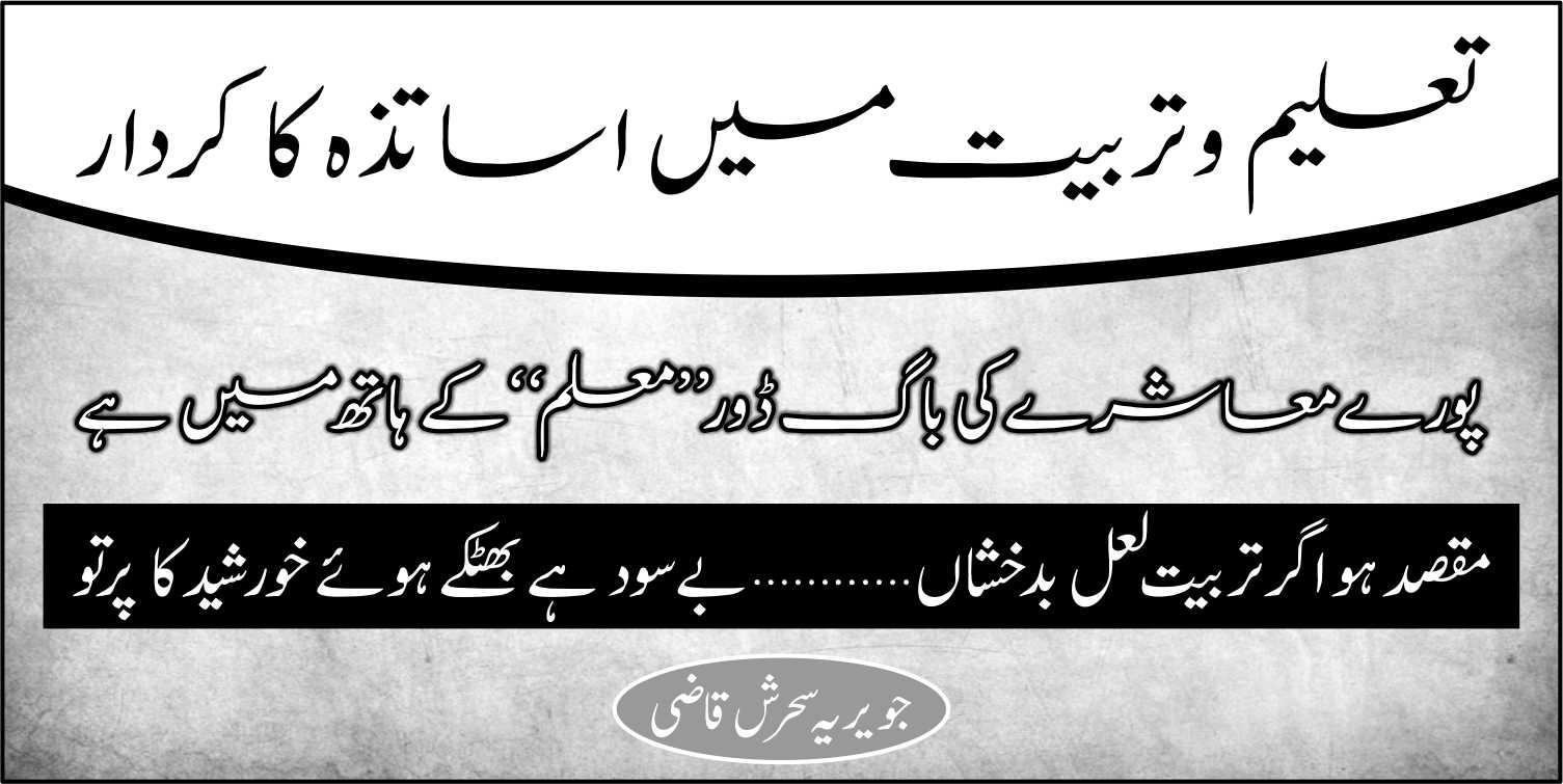 آج بیشتر معلم، تعلیمی، اخلاقی، روحانی لحاظ سے کہیں سے بھی ایسا دکھائی نہیں دیتا۔ ڈگریوں کا بوجھ اٹھائے ہوئے معاشرے کی معاشی بھیڑ چال کے ساتھ چل رہا ہے جنہوں نے حق کی تعلیم دینی تھی وہ خود موجودہ دور کے پیروکار بن گئے ہیں اور اچھے اور برے کی تمیز، خودشناسی اور خداشناسی سکھانے کے بجائے معاشرے کے کارخانوں کے آلہ کار بنارہے ہیں۔