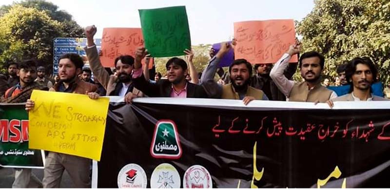 سیکرٹری جنرل مصطفوی سٹوڈنٹس موومنٹ ضیاء الرحمن ضلج نے ریلی سے خطاب کیا،شہدائے پشاور کو خراج تحسین پیش کرتے ہوئے کہا کہ آرمی پبلک سکول پشاور کے شہید بچے ہمارا فخر ہیں، شہداء نے جانیں دے کر علم کی شمعیں روشن کیں، پشاور کے بہادر بچوں نے دہشتگردی اور دہشتگردوں کو شکست دی، قوم پشاور کے شہیدوں کو کبھی نہیں بھول سکتی، تقریب میں یونس نوشاہی، احسن ایاز، میاں انصر محمود، فراز ہاشمی سمیت دیگر رہنماؤں نے بھی شرکت کی، طلباء نے کتبے اٹھارکھے تھے جن پر دہشتگردی کی مذمت اور شہداء کو خراج عقیدت پیش کرنے کے نعرے درج تھے۔