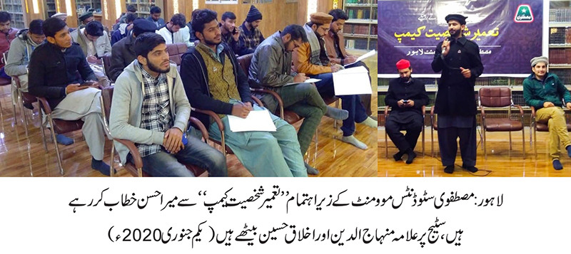 لاہور (یکم جنوری 2020ء) مصطفوی سٹوڈنٹس موومنٹ لاہور کے زیراہتمام فرید ملت ریسرچ انسٹیٹیوٹ میں ”تعمیر شخصیت کیمپ“کے عنوان سے تقریب کا انعقاد کیا گیا۔ تقریب میں مصطفوی سٹوڈنٹس موومنٹ لاہور ڈویژن کے عہدیداران نے شرکت کی۔ ایم ایس ایم کشمیراورو ناردرن زون کے صدر میر احسن منیر، علامہ منہاج الدین ڈپٹی ڈائریکٹر ٹریننگ تحریک منہاج القرآن، مصطفوی سٹودنٹس موومنٹ لاہور کے صدر اخلاق حسین نے طلبہ کو موضوع کی مناسبت سے لیکچرز دئیے۔ اس موقع پر سید فراز ہاشمی، حیدر مصطفی، انجینئر وقار، محمد ارسلان اور حسین نواز سمیت طلبہ رہنماؤں کی بڑی تعداد موجود تھی۔ تقریب سے خطاب کرتے ہوئے علامہ منہاج الدین نے کہا کہ اگر ہم حقیقت میں زوال کو کمال میں بدلنا چاہتے ہیں تو افراد کی شخصیت سازی بالخصوص بچوں کی اخلاقی، روحانی و سماجی تربیت پر توجہ دینا ہو گی، اگر بچوں کی تربیت اچھی ہو گی تو معاشرہ امن و سکون کا گہوارہ بن جائیگا۔ معاشرے کی تعمیر کا انحصار افراد کی تعمیر پر ہوتا ہے، افراد کی تعمیر میں خاندان، مدارس، یونیورسٹیز اور معاشرے کا کلیدی کردار ہوتا ہے، مستقبل کی تعمیر نسل نو کی تعمیر سے ہی ممکن ہے۔