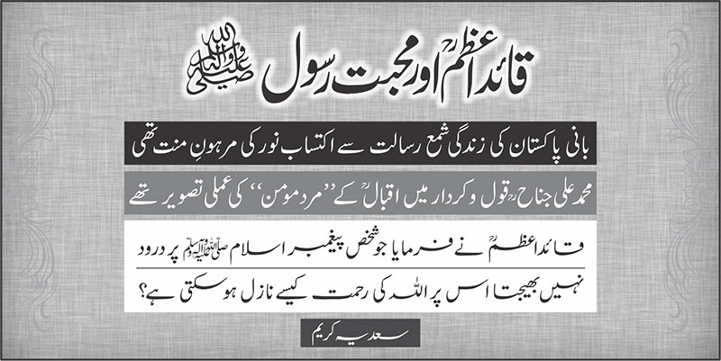 قائداعظم سچے اور پکے عاشق رسول تھے۔ وہ اپنے قول و کردار میں اقبال کے مرد مومن کا عملی پیکر تھے اور مومن کا سینہ عشق مصطفی ﷺ کا گنجینہ ہوتا ہے۔ آج ہمیں ان کی زندگی کو اپنے لیے مشعل راہ بنانے کی ضرورت ہے۔