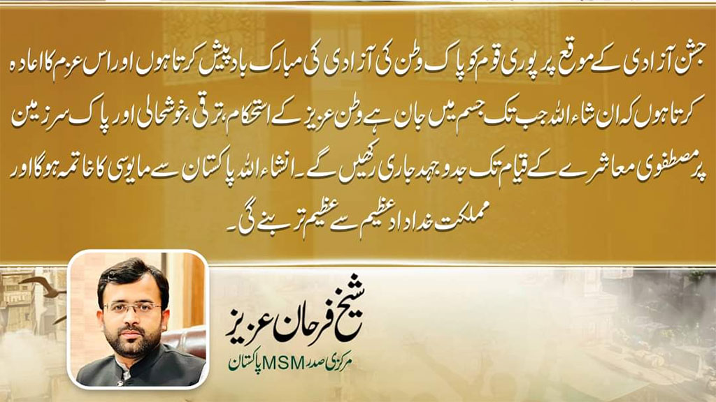 جشن آزادی کے موقع پر پوری قوم کو پاک وطن کی آزادی کی مبارک باد پیش کرتا ہوں اور اس عزم کا اعادہ کرتا ہوں کہ ان شاءاللہ جب تک جسم میں جان ہے وطن عزیز کے استحکام، ترقی، خوشحالی اور پاک سرزمین پر مصطفوی معاشرے کے قیام تک جدوجہد جاری رکھیں گے۔ انشاءاللہ پاکستان سے مایوسی کا خاتمہ ہوگااور مملکت خداد ادعظیم سے عظیم تر بنے گی۔