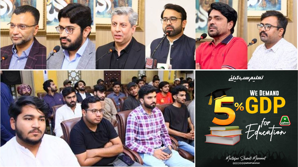 مصطفوی سٹوڈنٹس موومنٹ کے مرکزی صدر شیخ فرحان عزیز نے استقبالیہ کلمات میں کہا کہ 5 سے 16 سال کی عمر کے کروڑوں بچوں کو سکولوں میں لانے کیلئے تمام وسائل بروئے کار لانا ہوں گے۔ تعلیمی اداروں کو منشیات سے پاک کرنا ہو گا۔ جی ڈی پی کا 5 فیصد تعلیم پر خرچ کیا جائے۔ تعلیم کے بغیر ترقی کا خواب دیکھنا خود کو دھوکا دینے کے مترادف ہے۔ ترقی یافتہ ممالک کی ترقی کا راز تعلیم پر انویسٹمنٹ ہے۔ تعلیمی بجٹ میں اضافہ سے تعلیم کے شعبہ کی حالت بہتر ہوگی، اعلیٰ معیار کی تعلیم کے ساتھ جدید تحقیق کو فروغ دینا ضروری ہے۔